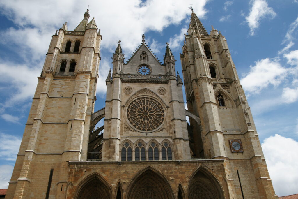 Pak jsme pokračovali úchvatnou katedrálou, mistrovským dílem gotické architektury, vystavěným v průběhu třináctého až patnáctého století. Složitě zdobení fasády i nádherná vitrážová rozeta nám připomínala chrám svatého Víta v Praze, ale vzhled nám připadal takový světlejší, „veselejší“, jako jsou téměř všechny gotické a novogotické památky ve Španělsku. Katedrála, která je známá i pod jménem Pulchra Leonina – Krásná Leóňanka – je perfektním příkladem toho, jak se v rámci období gotiky odlehčovali postupně sakrální stavby přenášením nosnosti na vnější struktury, a umožňovali umísťovat do zdí tak obrovská okna jako je možné vidět tady.